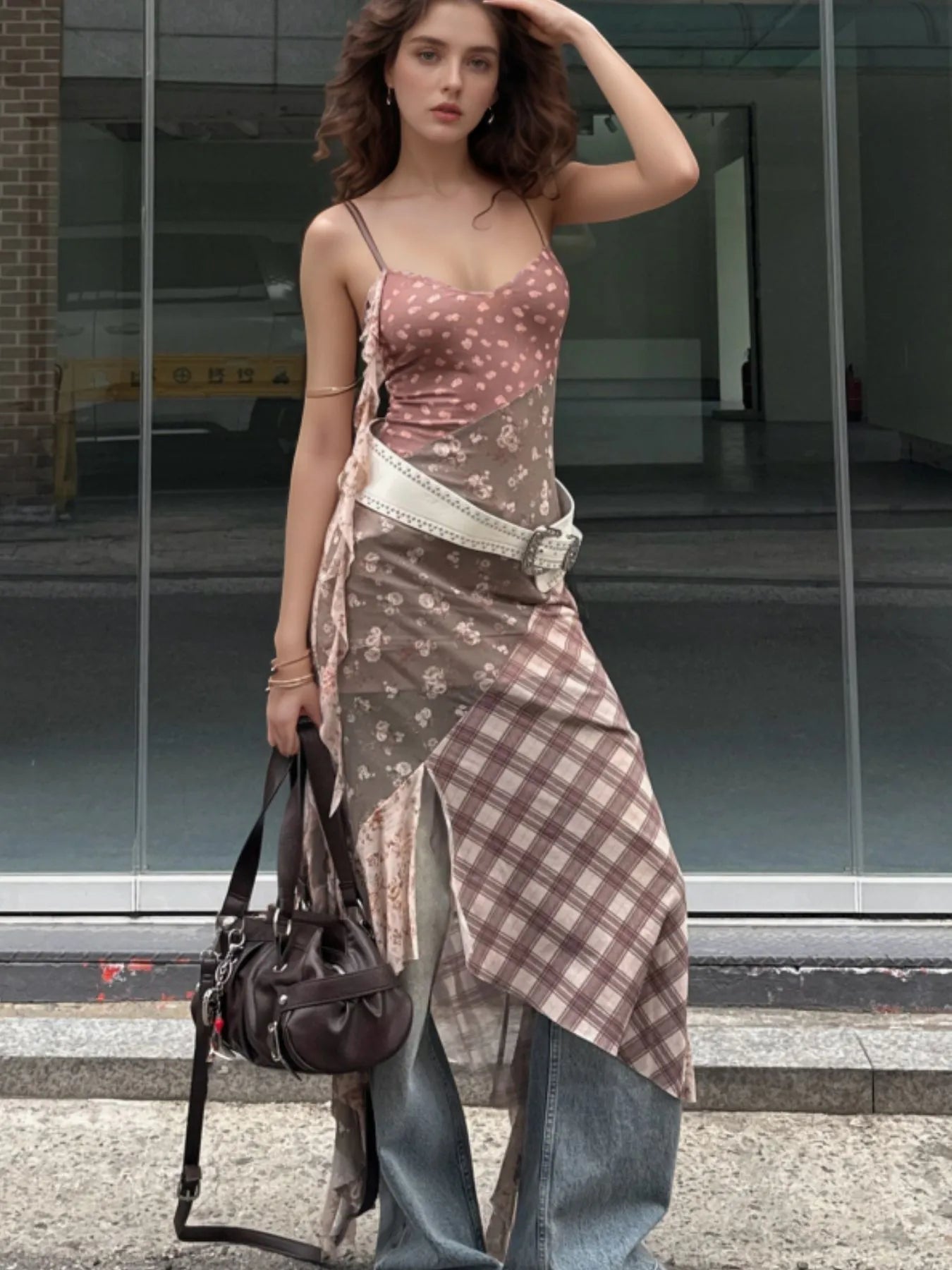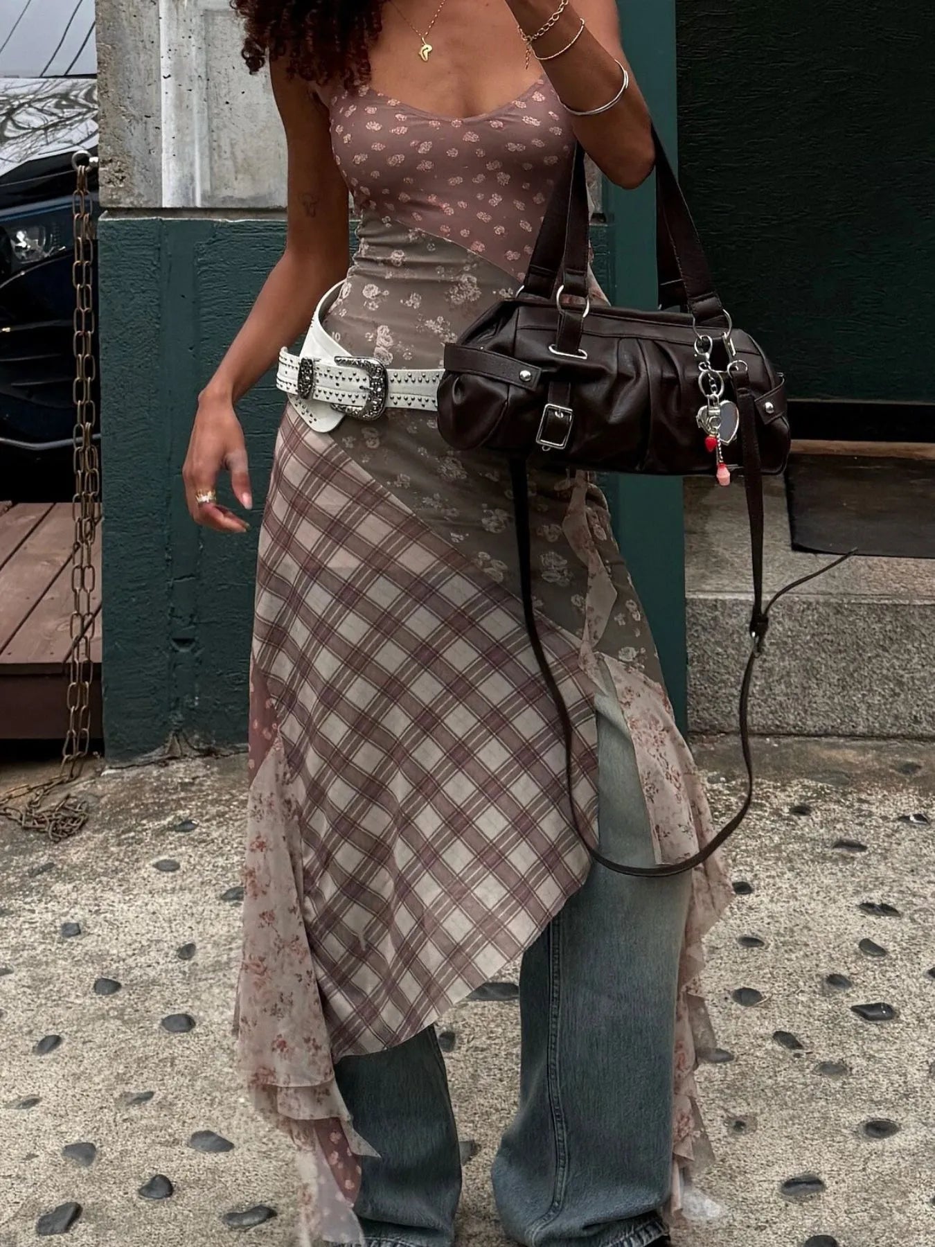 Asymmetric Plaid Detail Floral Print Cami Dress