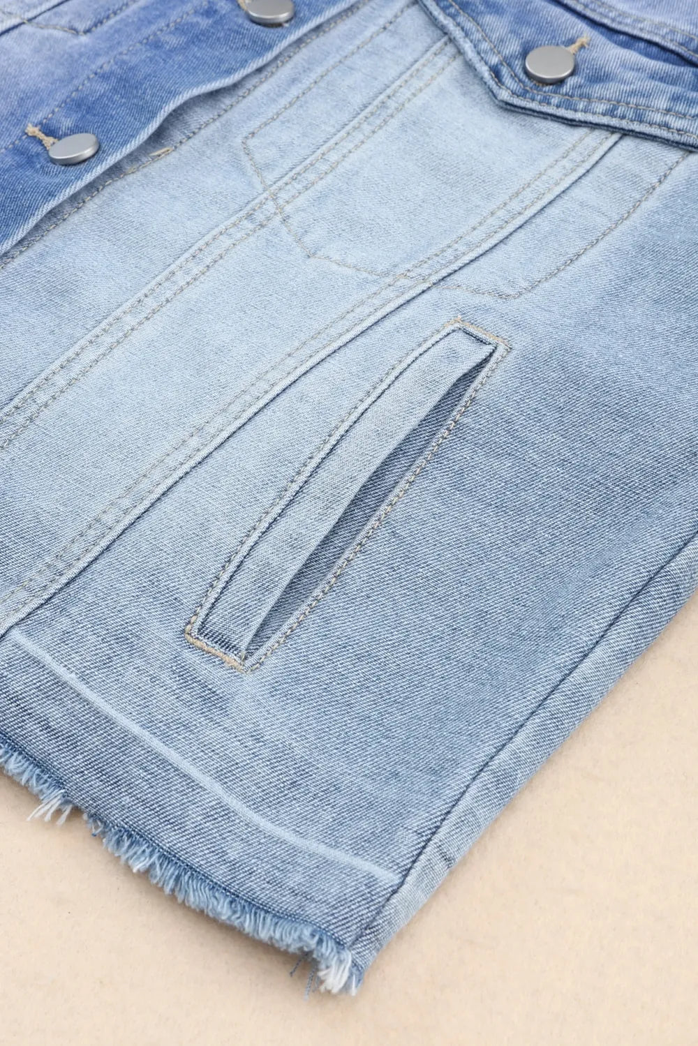- Features: Buttoned, Pocketed, Raw Hem, Distressed