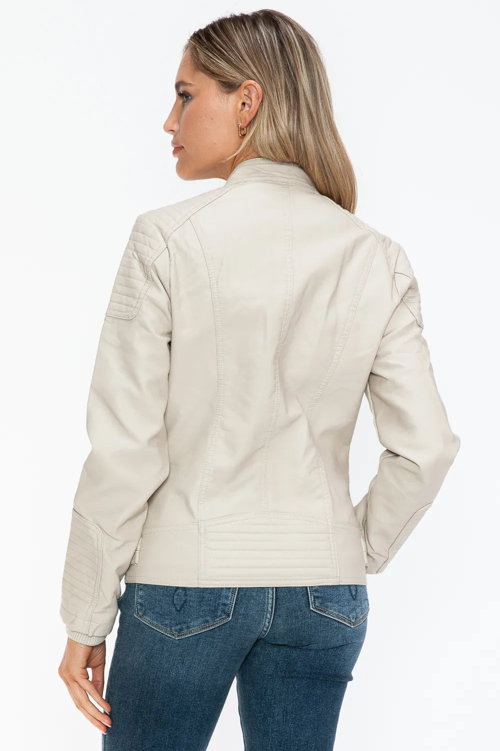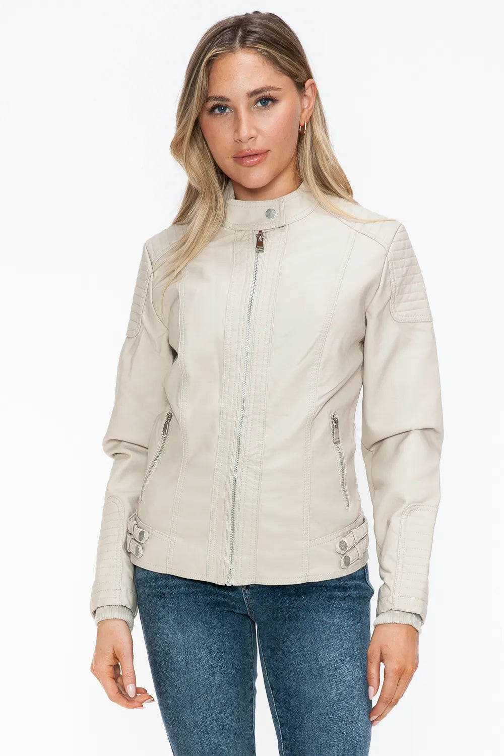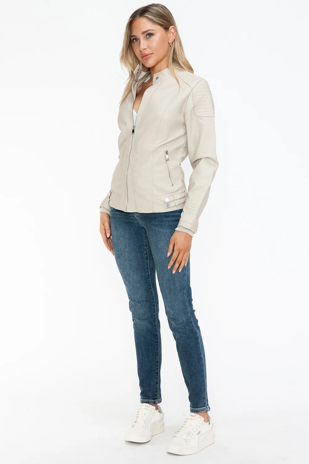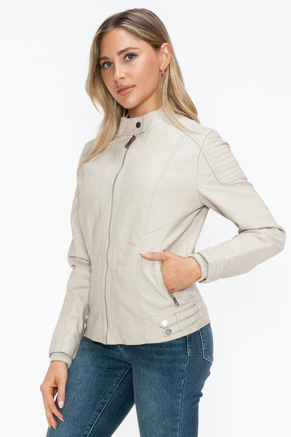 A faux leather biker jacket with side zip pockets is a trendy and edgy piece that combines style with functionality. This type of jacket is typically designed with a classic biker silhouette, featuring a front zipper closure, epaulettes on the shoulders, and side zip pockets for a modern touch. The faux leather material gives a sleek and fashionable look, while the side zip pockets add both style and practicality. This jacket is versatile and can add a cool and rebellious element to your outfit.