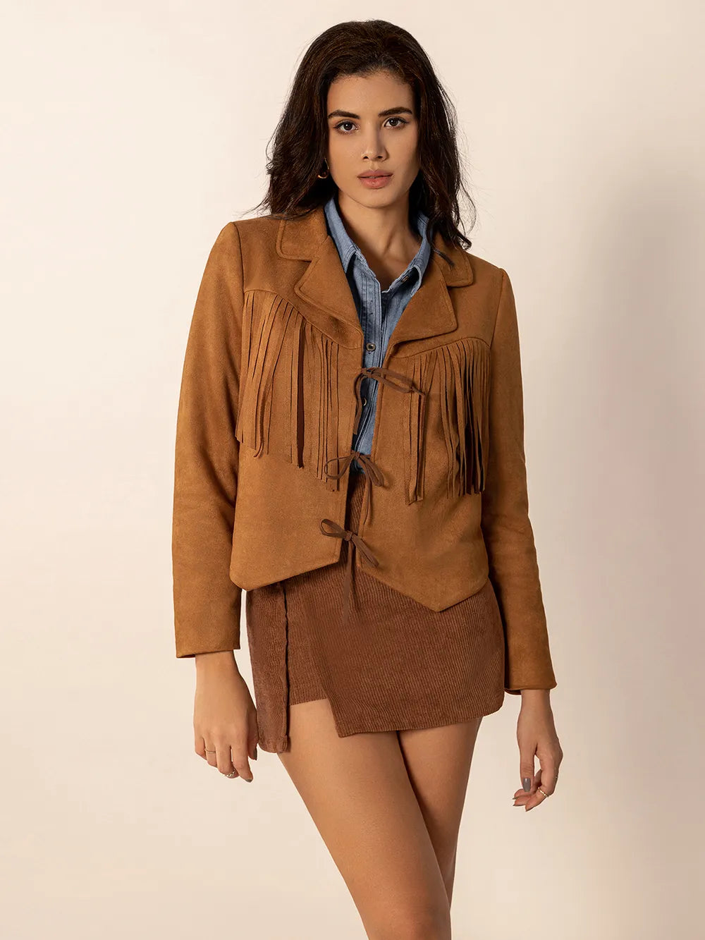 Tied Tassel Collared Neck Long Sleeve Jacket